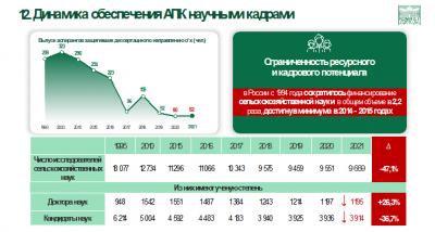 «Кадры решают все» - известное выражение. К сожалению за последние 10 лет резко сократилось количество хозяйств, в том числе фермерских хозяйств и что особенно плохо работающих специалистов, аграриев, зоотехников, ветеринаров и других. Аспирантура хиреет, число исследователей за 25 лет сократилось в 2 раза, как и количество защищающих кандидатов десертацию. Уезжало 12 тыс. ученых за рубеж, а сейчас – 70 тысяч! Значит, такие мы создаем условия, так насоздавали научные центры, лаборатории, что от нас бегут. Такая «утечка мозгов», при тех задачах, которые стоят перед российским АПК, может стать фатальным фактором, определяющим результат всей государственной политики на этом направлении. На этом направлении нам всем предстоит хорошо потрудиться.