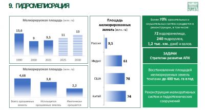 Уважаемые товарищи, еще раз по гидромелиорации. Ну вызов очень серьезный, я должен сказать, 60-70 млн. га. у наших товарищей и, в кавычках, у наших товарищей Американцев, и у наших истинных друзей – Китай, Индия, ну посмотрите, а мы, у нас 2,2 млн. орошаемых земель сегодня. Все хорошо у нас у академиков, у всех все хорошо, ставим план к 30-му году, за 40 лет хотим вернуться к показателям 1990 года, к 13 млн. Га.