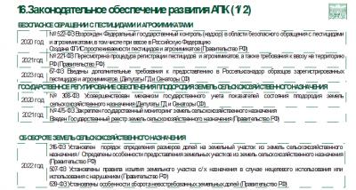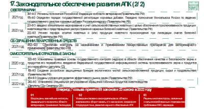 В целом мы приняли 89 законов только в седьмой Думе, а в двадцать втором уже двадцать три закона. Выстроили эту систему, работу с агрохимикатами и пестицидами в том числе ветеринарии, семеноводстве, племенном животноводстве и.т.д. В слайдах вы это видите. Ну давайте как-то поднимать уровень правоприменения, общими усилиями, и выполнять то, что Президент в этом плане прописал для АПК в стратегии, доктрине и законах.