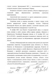 К сожалению, из-за отсутствия в зале председателей профильных комитетов, которые должны выразить согласие или не согласие с проектом, авторами инициативы было принято решение снять проект с рассмотрения и в рабочем порядке направить коллективное письмо депутатов-коммунистов в адрес премьер-министра М.В. Мишустина с требование вмешаться в ситуацию и принять необходимые решения. К сожалению, коллективной позиции Государственной думы по ситуации в Белгородском пограничье с поручением Правительству М.В.Мишустина выработать сегодня не удалось.
