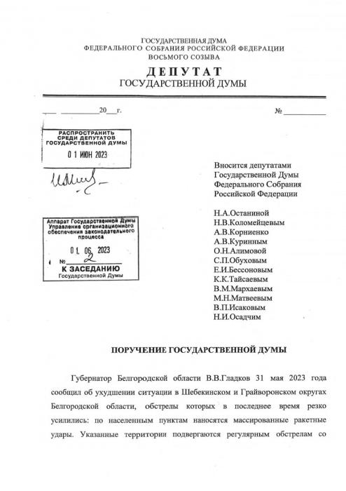 Пленарное заседание Государственной думы 1 июня началось с заявления группы депутатов фракции КПРФ Н.А. Останиной, Н.В. Коломейцева, А.В. Корниенко, A. В. Куринного, О.Н. Алимовой, С.П. Обухова, Е.И. Бессонова, К.К. Тайсаева, В.М. Мархаева, М.Н. Матвеева, B.П. Исакова, Н.И. Осадчего в связи с резким обострением ситуации в Белгородской области из-за непрекращающихся атак на российскую территорию формирований ВСУ.
