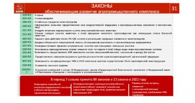 Уважаемые товарищи, мы вложились в законы, у нас приняты сотни законов, и много ещё внесено: и бюджетных, и социальных, и по аграрному комплексу за те 7 лет что мы возглавляем аграрный комитет государственной думы мы приняли 89 законов за прошлую пятилетку и почти они все работают на село, не случайно 510 млрд. в прошлом году было выделено на поддержку села.