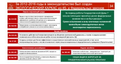 Завершая выступление, я бы хотел сказать о нашей большой работе по экологии. Мы создали экологический каркас из системы законов и по экологическому нормированию, и по обращению твердых бытовых, промышленных отходов, лесные, аграрные законы. Правоприменение, тут нужна воля, здесь во многом надо возвращаться к Сталинскому плану преобразования природы, сегодня у нас идет опустынивание земель, у нас варварское отношение к землям и у нас много чего сегодня не доделано, и мы знаем, как это делать, чтобы лес снова был нашими легкими, чтобы в лес было приятно зайти, и чтобы дары леса были на прилавках.