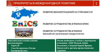 Дорогие товарищи, наша с вами программа испытана временем и время свидетельствует о том, что она правильная, верная, она, по существу,единственный выход из создавшейся ситуации и её необходимо брать за основу сегодняшней власти, потому что курс влево, разворот влево, он просто неизбежен. Последние события подтвердили правоту такого вывода, проводимая социально-экономическая политика на закваске либералов Гайдаровско-Ельцинской камарильи, довели страну до критической точки, а народ до обнищания. Обострилась обстановка, в том числе и во взаимоотношении между странами. И совсем не случайно КПРФ в своих программах заявляла, что одна из главных и приоритетных задач – это укрепление нашего союза стран СНГ в первую очередь, кроме того немаловажно укрепление взаимоотношений со странами БРИКС и ШОС. Сегодня мы видим положительную динамику в развитии торговых отношений в рамках Таможенного союза, ЕврАзЭС и Союза Белоруссии и России. Кроме того необходимо налаживание отношений с дружественными к России странами а именно КНР, Индией, Кубой, Вьетнамом, Северной Кореей Ираном, Венесуэлой и другими. Сегодня президент многое делает для того чтобы изменить международную ситуацию и снизить влияние наложенных санкций, уйти от той изоляции, в которую нас пытаются загнать Соединенные Штаты Америки и их сателлиты.