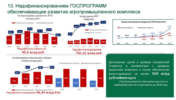 Подводя итоги хотел напомнить, что одна из наших главных депутатских задач – это выполнение 5 государственных программ, входящих в стратегию национальной безопасности РФ, в том числе и их финансирование в соответствии с паспортами. Уважаемые товарищи вот посмотрите в 4 раза недофинансировали программу по развитию сельских территорий, вы представляете как бы у нас развивалось село? сколько бы у нас было жилья, дворов и т.д., С таким банком и с его доступными кредитами, который готов работать на каждого фермера, на каждого жителя, на личные подсобные хозяйства. У нас есть над чем работать, чтобы при рекордных урожаях не забывать и про крестьянина, чтобы была у них рекордная зарплата.
