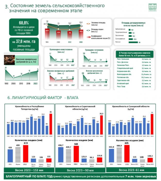 Я хочу ещё раз сказать, почему важно планировать ситуацию и планировать её прежде всего исходя из лимитирующих факторов. Вот мы ещё раз возвращаемся к Поволжью и я хочу чтобы мы все посмотрели результаты урожая, вот вы видите средний показатель урожайности по Татарстану от 18 до 22 ц/га, но как выдается хороший год по влажности то урожайность может достигать до 35 ц/га. И если взять представленные три субъекта (Республика Татарстан, Саратовская обл., Самарская обл.) в 2022 году мы получили дополнительно 7 млн тонн зерновых культур благодаря нивелированию лимитирующего фактора.