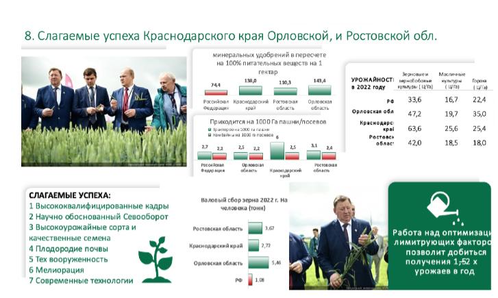 Уважаемые товарищи, посмотрите пожалуйста слайд по Ростову, Орлу и Краснодару, я держу в руках куст озимой пшеницы сорт Синева с 4 генеративными побегами, это очень высокая урожайность, и легко посчитать 2 грамма колос, пятьсот пятьдесят побегов и вот 110 центнеров с гектара. Таким образом мы видим, что слагаемые успеха Краснодарского края Орловской, и Ростовской области, состоят из высококвалифицированных кадров, научно обоснованного