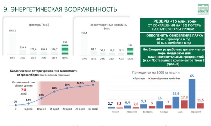 и разработки отечественной техники, и есть предложения по кредитам и лизингу, но давайте посмотрим на количество комбайнов, тракторов в других странах на 1000 Га посевов, вот в Белорусии 5 комбайнов на 1 тыс. га., а у нас 1,5-2, вот в этом плане мы должны подключить всех к этому вопросу, потому, что существует прямая зависимость количества сбора урожая от срока его уборки с момента созревания. К примеру, в случае задержки сбора до 30 дней потери урожая