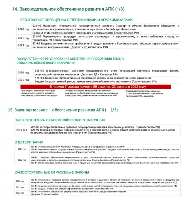 Уважаемые товарищи, я бы хотел ещё остановится на законопроектах, которые мы принимаем для того чтобы агропромышленный комплекс работал успешно, за 7 думу мы приняли 89 законопроектов, а за 2022 год 23 и они все сутевые, в ближайшие дни будем принимать уникальный закон по семеноводству.