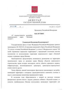 Депутат Госдумы от фракции КПРФ С.П. Обухов направил Президенту РФ письмо с призывом не подписывать законопроект об уничтожении главной заповедной зоны московского региона.