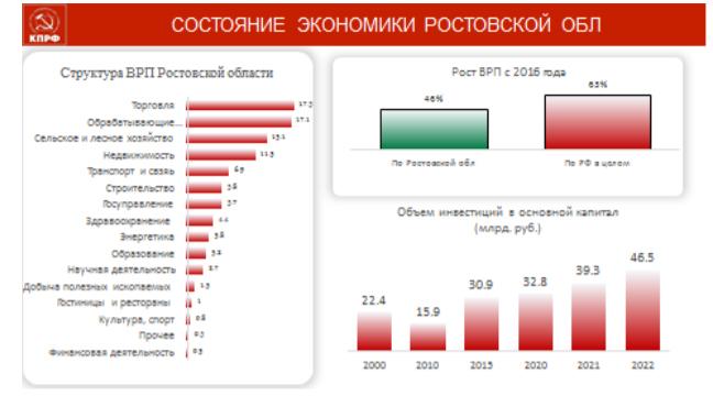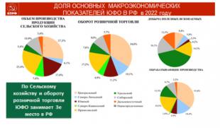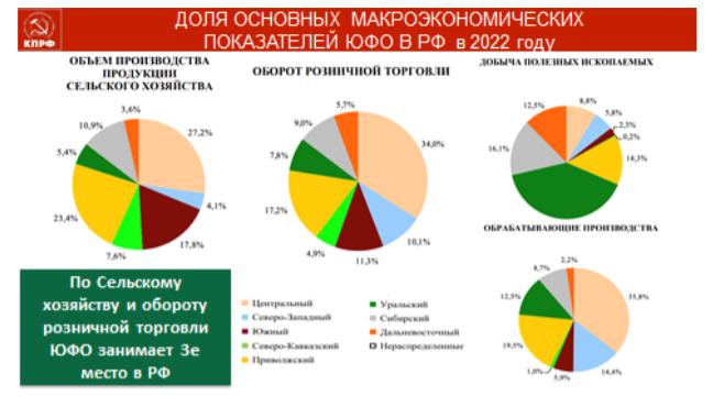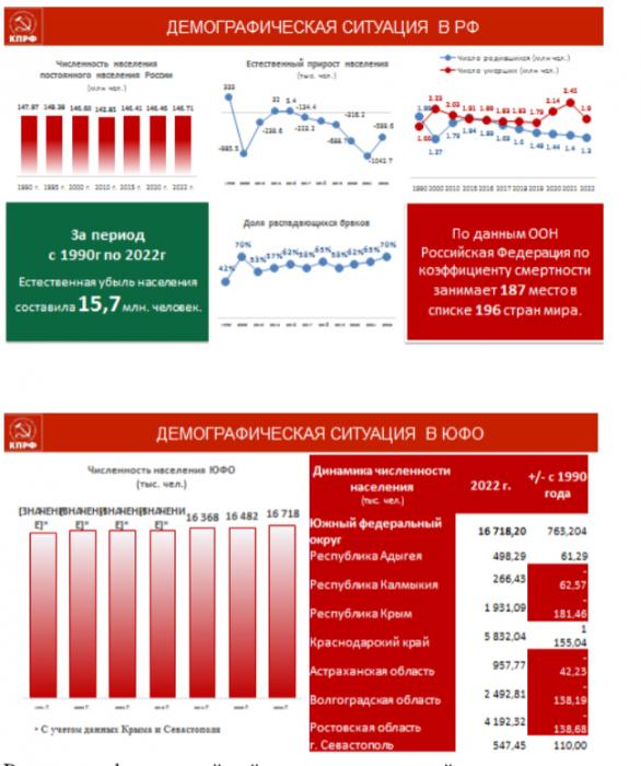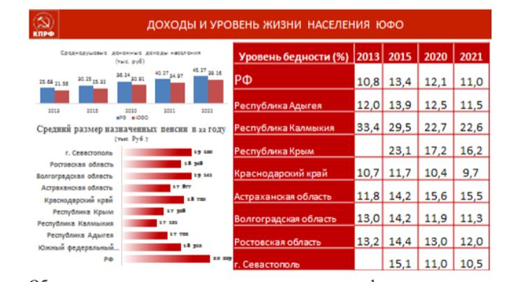 И получается, что, если взять доходы населения за последние 10 лет, они снизились в реальном выражении, а если посмотреть товары первой необходимости, то их стоимость, наоборот, выросла в среднем на 60%. Если посмотреть тарифы ЖКХ, то в среднем опять прирост 60%. Так что, нет даже элементарного намёка на улучшение жизни огромного числа людей. Если взять регионы Южного федерального округа, и посмотреть, может, у вас лучше. Потому что округ благодатный. И если взять в структуре ВРП по многим-многим вопросам, он занимает призовые места - третье в основном место, может быть, за исключением обрабатывающей промышленности, а в агропромышленном комплексе и по ряду других очень хороший результат. Но когда мы смотрим всё, что связано с пенсией, заработной платой и прочими социальными доходами, мы видим, что Южный округ не убежал никуда от среднероссийских показателей, а даже отстал. Если взять пенсии, мы видим, что среднероссийская пенсия составляет 20 тыс.руб., а на слайде вы найдёте в 4 регионах 17 тысяч с небольшим, то есть это всё таки солидное отставание. Если взять уровень бедности, то Крым и Калмыкия - это 22,6 процента бедного населения. Это очень серьезные негативные показатели, которыми мы должны оперировать критикуя власть, «Единую Россию», олигархическую политику и всё то, что связано с либеральной моделью развития. Мы, по большому счёту, должны забросить эту антинародную политику на обломки истории, заменив ее корневые принципы нашими социалистическими: национализацией стратегических отраслей, народными предприятиями, победным Красным Знаменем и патриотической самоотверженностью и единством нашей рабоче-крестьянской армии, бойцов СВО и тыла, которые выбрали профессию «Родину защищать».