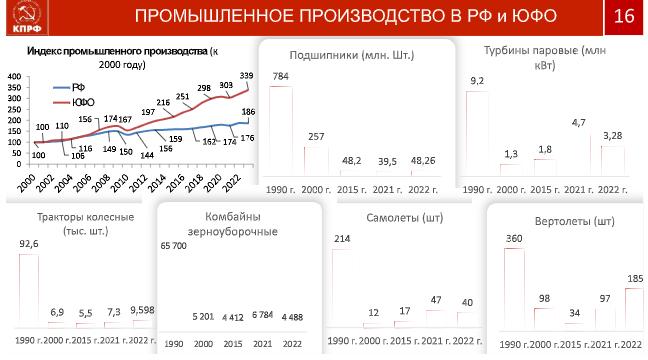 Когда Ельцин своим решением провозгласил передачу власти регионам, он намеревался, запустив процесс экономической деградации, региональной междоусобицы и анархии, ослабить Россию как государство. На горизонте реально создавались условия для возникновения условий для гражданской войны за передел территорий и экономических ресурсов. Тот же, нын покойный, Жириновский предрекал образование 40 княжеств. История с Чечней еще не забыта в народной памяти. Сегодня мы видим, как сражаются чеченцы на фронтах. Представьте, если бы всё это было по-другому, и логика событий шла по пути желаний либералов во власти... Поэтому, уважаемые товарищи, конечно, мы не должны забывать недавней истории, событий и результат политики либералов. Политики унижения наших ветеранов, унижения нашей молодёжи, развала промышленности, нищеты населения. Когда мы смотрим статистику по 1990 году, то Ростовская область и вообще Южный округ прошли через очень серьезный разрушительный этап жизни. Если взять производство комбайнов и тракторов - падение в десятки раз, подшипников – в 15 раз. В десятки раз регионы стали меньше производить разнообразной техники, которой ранее гордились. Всё это очень тяжело переживать, тяжело осознавать, что мы разорили и подготовку кадров, и многое-многое другое.
