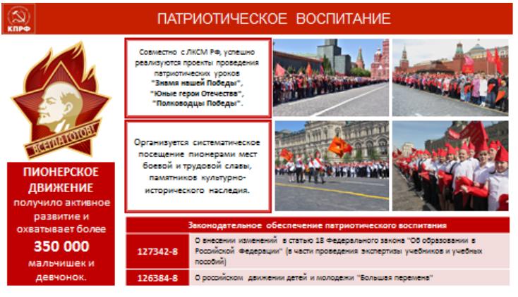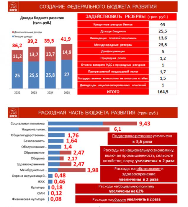 центр работы по развитию и качественному преображению нашего государства должны встать идеология русской Победы и система мобилизационной экономики. В законодательном портфеле КПРФ на сегодня 179 приоритетных стратегических федеральных Законопроектов по важнейшим направлениям, обеспечивающим, успешную реализацию наших Программ. Партия продолжает бороться за свои социально значимые проекты Законов "Образование для всех", "О государственном