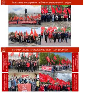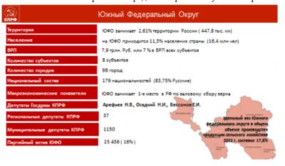 нечисти к управлению и, в том числе, нашей экономикой и социальной сферой. Я хочу, уважаемые товарищи, пожелать всем вам на выборах удачи. У нас в Ростове и в Калмыкии будут большие выборы. У нас в Адыгее и Волгограде будут городские выборы. У нас будут небольшие довыборы и в Краснодарском крае, и в Крыму. Мы не должны нигде здесь отступать и, конечно, большие выборы у нас будут в наших новых территориях. Мы должны помочь новым территориям не только гуманитарным грузом, но и нашим электоратом. КПРФ обязана оставаться в боевой способности бороться, созидать и решать самые трудные проблемы. Вооруженные марксистско-ленинским учением, опытом сталинской индустриализации и созидания, доверием народа и наследием социалистических достижений мы обречены на Победу. Идейно закаленная, вооруженная мощной идеологией, программной стратегией и опытом работы, КПРФ способна к созиданию и борьбе с любыми вызовами. Именно такая она необходима сегодня народу и общественному прогрессу. Позвольте выразить уверенность, что все структуры партии Южного Федерального округа готовы к преодолению существующих и новых вызовов и пожелать нам всем Победы. Большой убедительной, яркой Большой Победы.