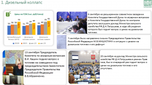 Я бы хотел показать вам слайды, которые четко иллюстрируют ситуацию с отсутствием доступа к топливу в стране. Уже в августе с началом роста цен на топливо мы начали бить тревогу. Мы провели ряд совещаний с Министерством сельского хозяйства РФ по ситуации с остановкой большого числа нефтеперерабатывающих заводов в связи с профилактикой и капитальным ремонтом. А уже 6 сентября на расширенном заседании Комитета по аграрным вопросам и Комитета по контролю с Министром сельского хозяйства РФ мы остро поставили все эти вопросы, после чего заместитель Министра энергетики РФ Сорокин Павел Юрьевич нас заверил, что за несколько дней проблемы будут урегулированы. Далее по результатам заседания было направлено письмо Председателю Правительства РФ о чрезвычайной ситуации за подписью председателей Комитета по аграрным вопросам и Комитета по контролю. Позже прошло совещание у Заместителя председателя Правительства РФ В.В. Абрамченко, на котором поднимался в том числе и упомянутый выше вопрос роста цен и дефицита дизельного топлива. И, как вы помните, 20 числа на «Правительственном часе» во время доклада Министра сельского хозяйства Д.Н. Патрушева повторно был задан этот вопрос заместителю Министра энергетики РФ П.Ю. Сорокину и опять тот же ответ - «дайте неделю».