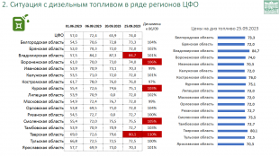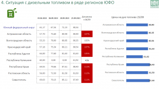 Теперь рассмотрим Южный федеральный округ. Если мы обратимся к динамике, то мы увидим, что ситуация и здесь не лучше – показатели зашкаливают и рост цен в сентябре также существенный. Цена за тонну дизеля выше 80 рублей по всему региону.