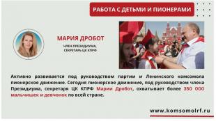 Активно развивается под руководством партии и Ленинского комсомола пионерское движение. Сегодня пионерское движение, под руководством члена Президиума, секретаря ЦК КПРФ Марии Дробот, охватывает более 350 000 мальчишек и девчонок по всей стране.