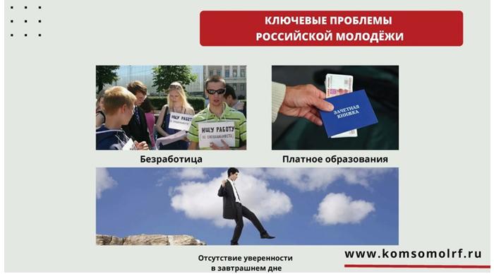 Результатом бедственного положения, в котором находится российская молодёжь, становится её отчуждение от государства – молодые люди всё реже отождествляют свои интересы с интересами страны. И винить в сложившейся ситуации, кроме буржуазной власти, некого: вот уже на протяжении почти 30 лет государство готово предложить молодым людям лишь ценности потребительства и индивидуализма. Капиталистическая информационная машина неустанно формирует у молодёжи мечты не о творчестве и созидании, а о лёгком и быстром заработке, прославляет статусное потребление. В результате теряется дух товарищества и коллективизма, и вместо Зои Космодемьянской и Александра Матросова примерами для молодых людей становятся «инстансамки» и «моргенштерны». Увы – подобная картина является закономерным результатом информационной и идеологической войны, цель которой – уничтожить главную угрозу существованию капиталистической системы - коммунистическую идею.