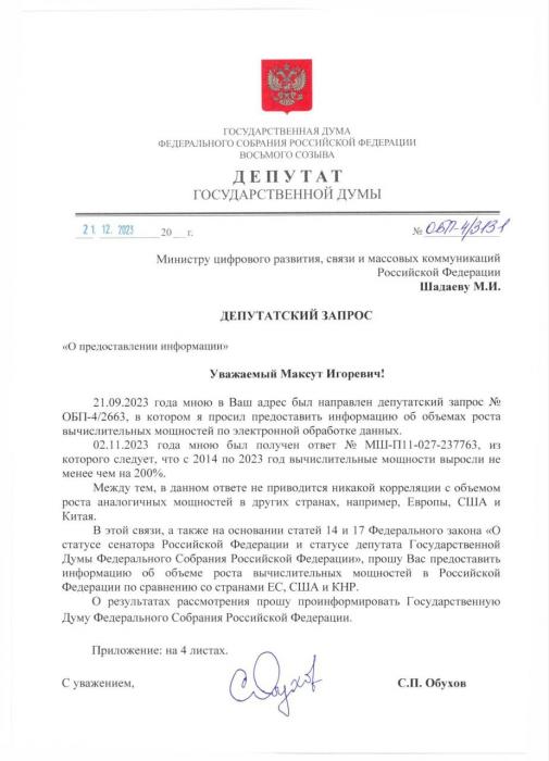 Намерен с коллегами по фракции и дальше поднимать немаловажную проблему развития вычислительных мощностей страны, для чего на днях запросил в Минцифры официальные сравнительные данные, которые ведомство почему то скрывает от депутатов Государственной Думы. Министр Шадаев боится парламентского контроля?