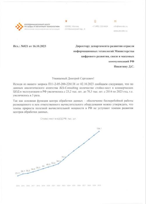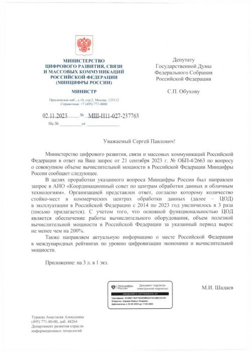 Недавно мною был получен ответ министра информации Шадаева, в котором он пишет, что за последние 9 лет вычислительные мощности (основа цифрового развития) выросли в России на 200%. Т.е. в годовой рост составил около 22%.