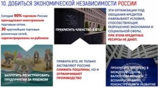 Наша программа системна, она апробирована в области, в районах, апробирована на наших народных предприятиях. Она основана на конкретных мерах. Под нее подготовлены сотни законов, многие, из которых уже приняты и работают сегодня. У нас нет сомнений, что реализация Программы Победы укрепит обороноспособность державы, увеличит могущество нашей армии и даст дополнительное развитие оборонным предприятиям, а многонациональному русскому народу РФ даст экономическую стабильность и должную социальную поддержку. Наши приоритеты: любовь к отечеству, вера в счастливое будущее, патриотизм, возрождение села и промышленности на основе планового хозяйства, во главе которого станет человек труда – наш советский человек!