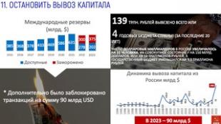 Стране давно пора выйти из Всемирного банка развития, ВТО, международного валютного фонда, которые все эти годы грабили Россию, давая унизительные рекомендации по ликвидации экономики. Думаю, что рекомендации ясны сами по себе. Нужен запрет на регистрацию предприятий за рубежом, национализировать брошенный иностранный бизнес, наложить запрет на вывоз капитала, установить строгий валютный контроль.