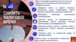 Очень серьезно стоит вопрос по налогообложению в промышленности. За 30 лет изобрели слишком много избыточных налогов, которые необходимо отметить, потому что они мешают развитию экономики (слайд №14). Наши предложения мы прописали в программе и они одобрены хозяйственными руководителями разных отраслей.