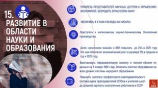 Для развития экономики необходимо поднять уровень научно-технического прогресса. Наша программа предусматривает резкое повышение средств на научно-исследовательскую работу, восстановление престижа академии наук, ученых-исследователей. Прежде всего, надо вытащить из нищеты ученых! Если в советское время доктор наук, профессор получал зарплату в размере 500 рублей, что в 1980-е годы, приравнивалось к зарплате руководителя области или республики, то сегодня зарплата профессора немногим выше дворника! Представляете, как ценился труд ученого и как он ценится сейчас!