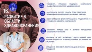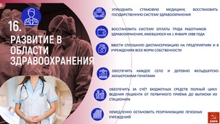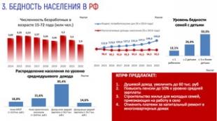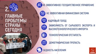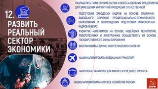 В стране уничтожена отраслевая наука. Разорили профтехучилища, перестали готовить инженерные и технические кадры. Под слом попали научно-исследовательские институты, вместе с прикладной наукой. Мы предлагаем восстановить профессионально-техническое, и заводское обучение, восстановить подготовку технических и инженерных кадров, возродить отраслевую науку. Внедрение новейших технологий, роботизация, станкостроение, электроника, требуют подготовки высококвалифицированных кадров, которых сегодня катастрофически не хватает. Нам надо действовать, как учил Иосиф Виссарионович Сталин, оперативно и эффективно. Немедленно восстановить единую энергетическую систему, объединив генерирующие мощности, сетевые компании и сбытовые под государственным управлением. Тоже касается железнодорожного транспорта, морского и речного флота, авиации и недропользования. Дать широкую дорогу развитию микро, малого и среднего бизнеса. Произвести оптимизацию налоговой системы и т.д. Все это прописано в нашей социально-экономической программе и зафиксировано на 12 слайде.