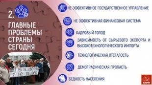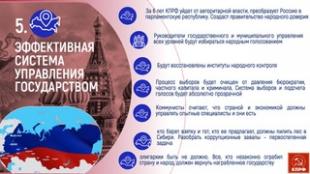 Кричащей проблемой является система управления государством. Эффективность государственного управления оценивается, технологической отсталостью, бедностью населения, демографической катастрофой. Что предлагает КПРФ в этом плане. На 5м слайде представлено, что мы предлагаем и что мы сделаем буквально за ближайшие шесть лет. Я полагаю, что исходя из опыта, который был в Советской России, в Советском Союзе и сегодня есть в некоторых социалистических странах, ни один из этих предложенных пунктов не скомпрометировал себя. Этот опыт показывает, что государственное управление необходимо доверять опытным профессиональным кадрам. Выборные должности должны занимать также профессионалы, а не все желающие, а выборы должны быть свободными от диктата власти, достойными и прозрачными. Надо избавляться от коррупции, и сделать все необходимое, чтобы те, кто погряз в этой коррупции, были изолированы от общества и трудом искупали свою вину. Мы должны сделать все, чтобы не было олигархии, не было предателей и изменников, чтобы не было казнокрадов и воров. Наша задача возродить патриотизм и именно патриотам доверить управление государством, чтобы система управления была эффективной.