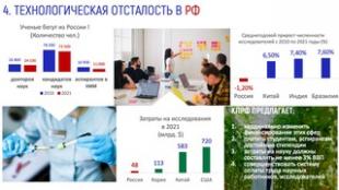 Наука просела везде и всюду, новые технологии российский бизнес покупает за границей, а в своей стране нет специалистов начертить даже гайку. Выпускники ВУЗов, аспиранты бегут за границу на высокую зарплату, а в России остаются пожилые ученые, которым передать свой опыт некому (слайд №15). Ситуация критическая и если не принять меры сегодня, через пять лет от науки ничего не останется. Финансирование науки продолжается по остаточному принципу. Бюджетные ассигнования на исследования в России ничтожно малы, когда в Китае и США значительно больше. Естественно, там и экономические успехи не сравнить с Россией.