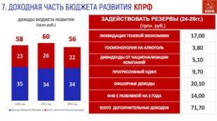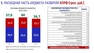 КПРФ разработала свою социально-экономическую программу развития России, на базе бюджета развития, который был представлен на третьем международном экономическом форуме в г. Орле и одобрен хозяйственными руководителями страны. КПРФ обеспечит решение главных проблем страны: бедность населения, демографическая пропасть, технологическая отсталость, зависимость от экспорта и импорта, не эффективное государственное управление, не эффективная финансовая система, кадровый голод.