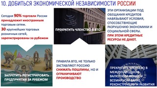 Нам необходимо добиться экономической независимости России. Без этого нам экономику не поднять! Почему это важно? Сегодня 90% торговых сетей принадлежит иностранцам, 30 крупнейших сетей зарегистрированы в офшорах, о чем свидетельствует 10-й слайд. А ведь торговля является проводником отечественных товаров, но в России это проводник импорта. Кроме того, у нас размещены тысячи иностранных предприятий и десятки тысяч наших предприятий, зарегистрированы за рубежом. Вся эта пятая колонна в трудную минуту предала и Россию, и ее народ!