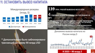 Основа нашей экономической программы, это бюджет развития (слайд №7). Синим цветом на графике отмечен сегодняшний бюджет, красным наши предложения, из чего они складываются прописано в правой части слайда. Бюджет 58,6 и 56 трлн. рублей это реальный бюджет, который мы предлагаем, мы не раз показывали его доходную часть. К тем 35 трлн., которые у нас есть сегодня в бюджете, будем добавлять средства из серой зоны экономики, офшоров. В том числе и от реализации нами предложенных законов, начиная от подоходного налога, монополии на вино-водочные изделия, отмены бюджетного правила и т.д. Преобразуем фонд национального благосостояния, будем использовать активы олигархии и средства от национализации в интересах развития промышленности, сельского хозяйства и науки.