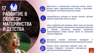 В области материнства и детства мы предусматриваем широкий спектр поддержки семей, как выплата стипендий в размере прожиточного минимума (родителю и ребенку), бесплатные семейные общежития, гарантированное первое рабочее место по окончании учебного заведения, доступность и бесплатность молочных кухонь, яслей, детских садов, оздоровительных лагерей и досуговых учреждений, спортивных объектов и секций и.т.д.(слайд №17).