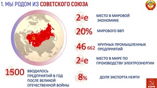 Почему я об этом начал говорить? У любой программы должны быть смысловые корни, и они есть и у нашей партии, и у нашей программы. Мы родом из Советского Союза. Наша Родина занимала второе место в мировой экономике, 20% мирового ВВП. Ее не спалила мировая война и на удивление всего мира она возродилась после войны в самые кратчайшие сроки. Ее бесплатное образование, бесплатное здравоохранение, бесплатное жилье и отсутствие безработицы восхищали весь мир! ( Слайд №1)