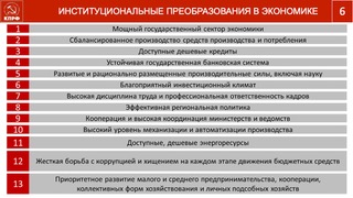 На следующем 6-м слайде представлено решение институциональных проблем. Конечно, это мощный государственный сектор экономики, сбалансированное производство и потребление, это дешевые кредиты, устойчивая государственная банковская система, это кооперация, это дисциплина труда и т.д., опять же поддержка среднего и малого бизнеса, фундаментальная и прикладная наука.