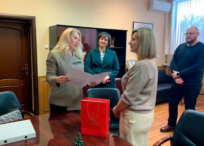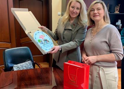 Слова благодарности за активную и патриотическую позицию института заместитель Комитета Государственной Думы по защите семьи, вопросам отцовства, материнства и детства Мария Дробот высказала проректору по учебно-методической и воспитательной деятельности Анне Юдиной. Представителю КПРФ руководители института передали уникальное панно из декоративных тарелок, которые сделали и расписали своими руками дети из Донецкой Народной Республики