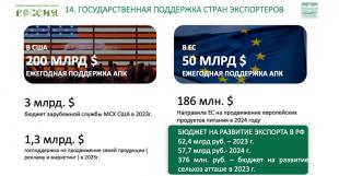 Посмотрите, как поддерживают американцы или ЕС своих селян, и то они там бастуют у них. Можем посмотреть - 200 миллиардов. А у нас мы видим 6 миллиардов долларов. 200 и 6 - разница в 33 раза получается. 50 миллиардов ЕС субсидирует в свое сельское хозяйство. Вот посмотрите, сколько США и ЕС дают на поддержку продвижения своей продукции, мы должны понимать, с кем нам придется конкурировать. И это означает, что в данном направлении нам тоже необходимо работать.
