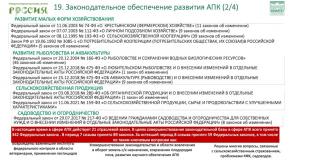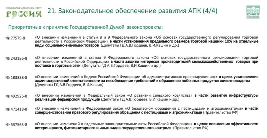 Мы приняли целую группу законов по земле, целью которых является снятие препонов по возврату земли в севооборот. Мы восстановили всю ветеринарную вертикаль, создали систему борьбы с теми опасностями, которые есть. Также закон по зерну, о семеноводстве и племенном животноводстве, бюджетные, налоговые законы, законы по водным биологическим ресурсам и многое другое.