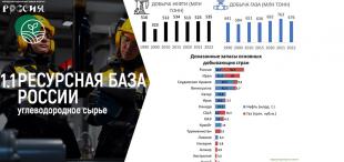 На слайде 1.1. вы видите данные по углеводородному сырью, так как без этих данных трудно говорить о нашем величии. Посмотрите, пожалуйста, мы первые в мире по запасам газа, и шестые по запасам нефти в мире.