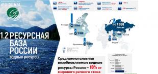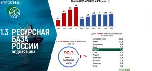 Российская Федерация принадлежит к числу государств, наиболее обеспеченных водными ресурсами. Посмотрите на слайд 1.2., мы занимаем второе место в мире по среднемноголетним возобновляемым ресурсам. У нас с вами 10% от мирового речного стока. Это говорит о наших уникальных возможностях. Мы производим и добываем 5,3 миллиона тонн рыбы. Доля России в мировом вылове водно-биологических ресурсов в 2022 году составила 5%.