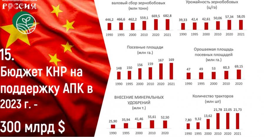 Посмотрите на Китай, который выделяет на поддержку АПК 300 млрд. долларов и наращивает каждый год по два миллиона мелиорированных земель. И Индия так же. В Америке стало 60. В 90-м у нас было 13 миллионов гектаров. А как мы сейчас занимаемся мелиорацией? На данный момент у нас 4 неполных действующих миллиона гектаров. Вот возможность у них получать уже не два урожая, а больше. Конечно, другие климатические условия, нужно это тоже учитывать, но все же.