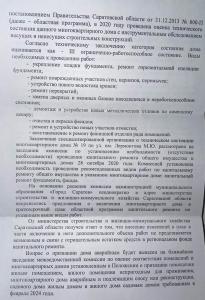 28 октября 2020 года была установлена необходимость проведения работ по капитальному ремонту общего имущества (капитальный ремонт фундамента и фасада). Администрация Саратова в адрес министерства строительства и ЖКХ Саратовской области направляла предложения о включении многоквартирного дома в краткосрочный план областной программы капитального ремонта. Однако Минстрой отмечал, что включение дома в план невозможно в связи с отсутствием средств.