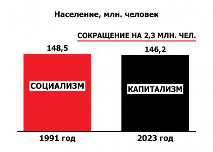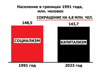 С 2014 года в состав Российской Федерации вошел ряд новых регионов. Поэтому, чтобы более точно оценить, как капитализм сказался на демографических процессах, надо сравнить численность населения страны в границах 1991 года. Без присоединенных регионов население России оказывается уже почти на 5 миллионов человек меньше, чем в 1991 году (143,7 млн. человек сейчас против 148,5 млн. человек тогда).