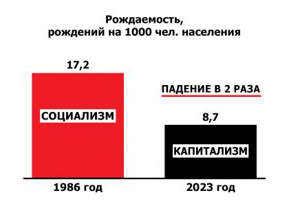 Рождаемость в России в 2023 году оказалась вдвое ниже, чем была в РСФСР в середине 1980-х годов (17,2 рождений на 1000 человек населения в 1985 году и 8,7 рождений в 2023 году). Смертность же, напротив, заметно выше.