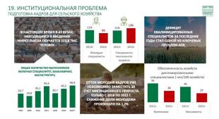 Почему я говорю об общих проблемах? Потому что частные проблемы легче решать. А если мы не решим общие институциональные проблемы, то мы никуда не двинемся. Я их сгруппировал в отдельный слайд, посмотрите на них. О диспаритете мы уже говорили, о рентабельности тоже говорили. По заработной плате задача поставлена. У нас чётко прописано в комплексной программе развития сельских территорий решение этой задачи — хотя бы выйти на показатели средней зарплаты по РФ.