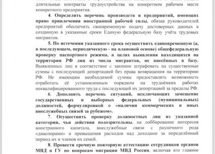 3. В кратчайшие сроки разработать положение о трудовой миграции, посредством которого будет, в том числе, внесена ясность в порядок и условия приглашения трудовыми мигрантами семей и родственников на территорию РФ в период действия их трудовых контрактов. Право на приглашение семей и родственников должны иметь лишь лица, внесённые в перечень ценных специалистов и заключившие длительные контракты трудоустройства на конкретном рабочем месте конкретного предприятия.