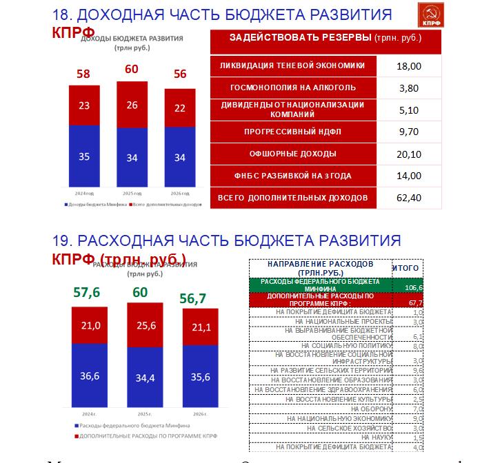 Наши недра должны служить нашей Великой России. Наши средства должны обеспечивать, безусловно, всё, что связано с социальной сферой, с образованием, наукой, здравоохранением. Есть бюджет национального развития, разработанный КПРФ.