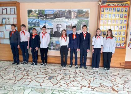 На входе в учебное заведение гостей встретили пионеры и тимуровцы, которые прочитали стихи о Пензенском крае. Директор школы Андрей Ревунов и Дмитрий Филяев, который несколько лет проработал в 58-й школе учителем истории и обществознания, а затем и директором, провели для Марии Дробот экскурсию по школе, показали учебные классы, портреты пионеров-героев и стенд с информацией о Г.В. Мясникове.